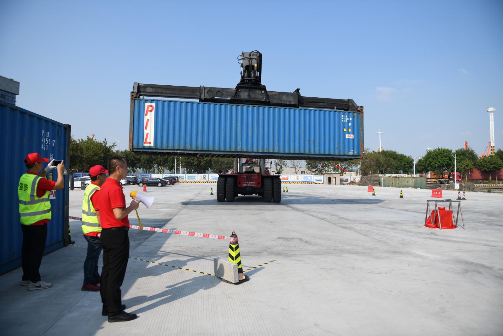 經(jīng)過前期的理論學(xué)習(xí)及考試,來自11家單位的24名選手闖入今天的實(shí)操比拼環(huán)節(jié)??简?yàn)車技,他們要駕駛近70噸重的“龐然大物”在S形道路上精準(zhǔn)避障;考驗(yàn)精度,他們要將放箱誤差控制在2厘米內(nèi);考驗(yàn)“柔”勁,他們要用集裝箱壓動(dòng)裝置完成博餅,讓6顆骰子全部進(jìn)碗;考驗(yàn)“穩(wěn)”性,他們還要保證集裝箱頂放置的4個(gè)礦泉水瓶不掉落。