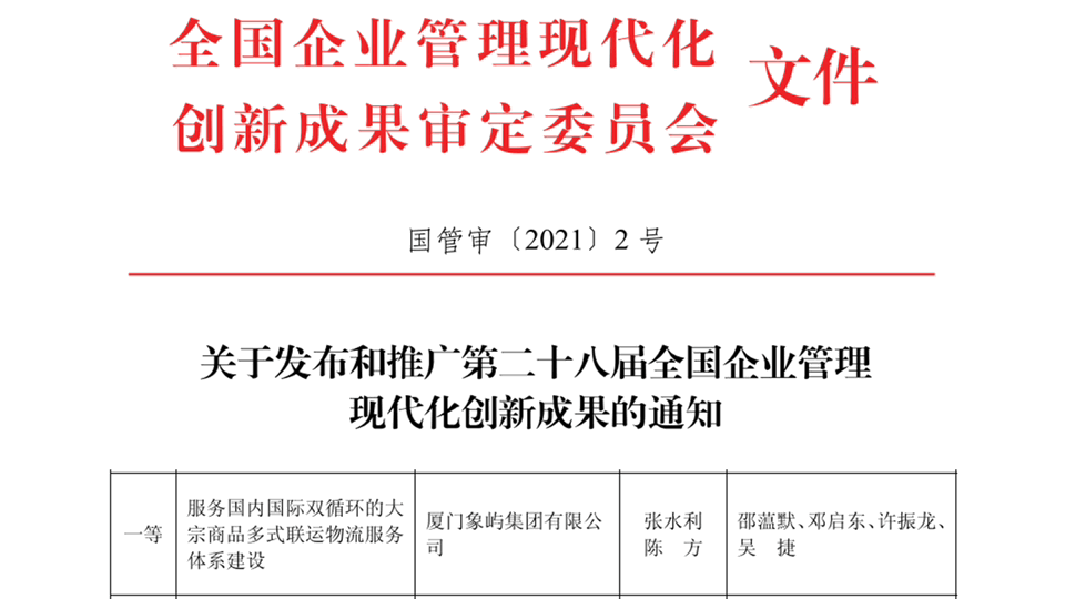 2022年,第二十八屆全國(guó)企業(yè)管理現(xiàn)代化創(chuàng)新成果名單發(fā)布,象嶼集團(tuán)憑借《服務(wù)國(guó)內(nèi)國(guó)際雙循環(huán)的大宗商品多式聯(lián)運(yùn)物流服務(wù)》榮獲一等獎(jiǎng),成為廈門(mén)首家獲評(píng)該獎(jiǎng)項(xiàng)一等獎(jiǎng)的企業(yè)。11月,倫敦設(shè)計(jì)獎(jiǎng)(London Design Awards)結(jié)果出爐,上海天安象嶼西江悅榮獲建筑設(shè)計(jì)類別最高獎(jiǎng)金獎(jiǎng),福州象嶼國(guó)貿(mào)星璟原獲展示空間銀獎(jiǎng)。此外,2020-2021年度全國(guó)企業(yè)文化優(yōu)秀成果一等獎(jiǎng)、2022金蜜蜂企業(yè)社會(huì)責(zé)任·中國(guó)榜“ESG競(jìng)爭(zhēng)力·責(zé)任采購(gòu)”獎(jiǎng)、福建五一勞動(dòng)獎(jiǎng)狀、福建省優(yōu)秀企業(yè)家等重磅獎(jiǎng)項(xiàng)也先后花落象嶼,凸顯社會(huì)對(duì)象嶼的高度認(rèn)可。
