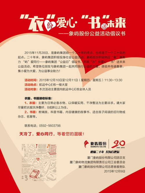 11月20日,集團(tuán)工會(huì)、團(tuán)委、志愿者總隊(duì)聯(lián)合發(fā)出《象嶼集團(tuán)11.28“公益日”倡議書》,倡導(dǎo)從今年起,將每年的11.28即集團(tuán)成立日,設(shè)立為“象嶼公益日”,鼓勵(lì)全體員工在這一天走出工作崗位,走進(jìn)社會(huì)去做力所能及的志愿善舉。公益源于“八方助力”,美在“百花齊放”。自倡議書發(fā)布以來,集團(tuán)首次“公益日”活動(dòng)受到各公司熱烈支持和積極響應(yīng)。