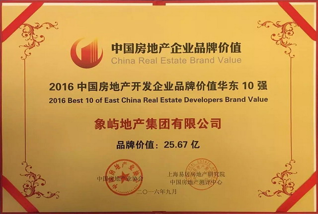 9月21日, “2016中國房地產(chǎn)企業(yè)品牌價值測評成果發(fā)布會暨房地產(chǎn)品牌發(fā)展高峰論壇”在廈門隆重舉行。會上發(fā)布了《2016中國房地產(chǎn)企業(yè)品牌價值測評研究報告》,及2016中國房地產(chǎn)開發(fā)企業(yè)品牌價值50強(qiáng)、華東區(qū)域10強(qiáng)在內(nèi)的多個相關(guān)榜單。象嶼地產(chǎn)以25.67億元品牌價值榮膺2016中國房地產(chǎn)開發(fā)企業(yè)品牌價值華東10強(qiáng),這已是公司連續(xù)第三年入圍華東區(qū)域品牌價值TOP10。此外,象嶼都城項(xiàng)目獲評 “2016中國房地產(chǎn)優(yōu)秀品牌項(xiàng)目”。