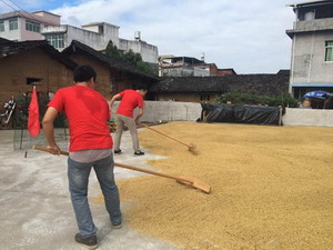 曬谷場的大姐說,曬谷并不簡單,遇上天氣不好要反復收回,再次拆包、攤平、晾曬。曬谷揚起的灰色還容易造成皮膚過敏。我嘗試了幾下已經(jīng)感受到腰部手臂的負荷。農(nóng)活很艱苦,但曬谷大姐仍是每日不厭其煩地勞作,微笑面對自己的生活。