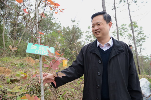 象嶼集團(tuán)黨委副書記邵蕰默為去年種下的喬木楓樹掛上號(hào)碼牌。