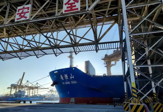 廣東省廣州市,象嶼股份與中遠海散運合作的班輪,滿載5萬噸玉米,??吭趶V州新港。這樣的班輪,每30天就有一班。這些糧食從富錦走鐵路到大連,從大連走海路到廣州,公路運輸比重不到全程的1/10,運輸成本大大降低。