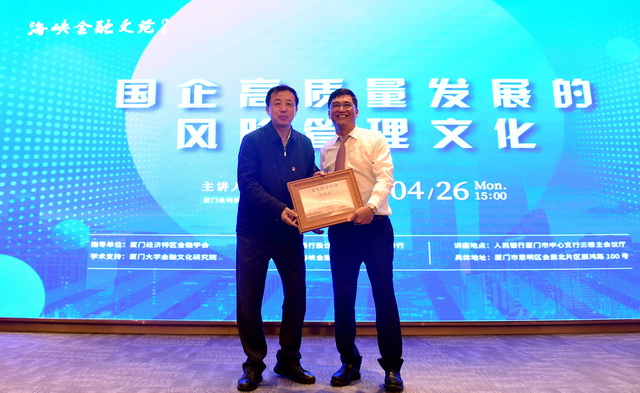 4月26日下午,應(yīng)廈門經(jīng)濟(jì)特區(qū)金融學(xué)會的邀請,象嶼集團(tuán)黨委書記、董事長張水利站上“海峽金融文苑”的講壇,面向全市百余家金融機(jī)構(gòu)負(fù)責(zé)人,做《國企高質(zhì)量發(fā)展的風(fēng)險管理文化》專題分享。中國人民銀行廈門市中心支行行長、廈門經(jīng)濟(jì)特區(qū)金融學(xué)會會長王彥青出席講座,并為張水利董事長頒發(fā)感謝狀。本次活動由廈門經(jīng)濟(jì)特區(qū)金融學(xué)會指導(dǎo)、廈門大學(xué)金融文化研究院提供學(xué)術(shù)支持、中國銀行廈門市分行主辦。中國銀行廈門市分行副行長陳顥主持講座。