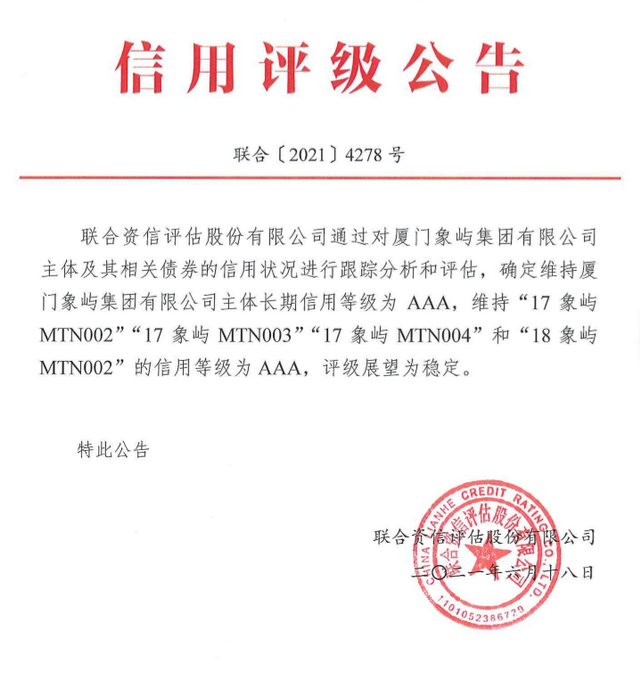 6月21日,國(guó)內(nèi)權(quán)威評(píng)級(jí)機(jī)構(gòu)聯(lián)合資信評(píng)估股份有限公司(以下簡(jiǎn)稱(chēng)“聯(lián)合資信”)發(fā)布廈門(mén)象嶼集團(tuán)有限公司(以下簡(jiǎn)稱(chēng)“象嶼集團(tuán)”)2021年跟蹤評(píng)級(jí)報(bào)告,確定維持象嶼集團(tuán)主體長(zhǎng)期信用等級(jí)和公司債券信用等級(jí)為AAA,評(píng)級(jí)展望為穩(wěn)定。
