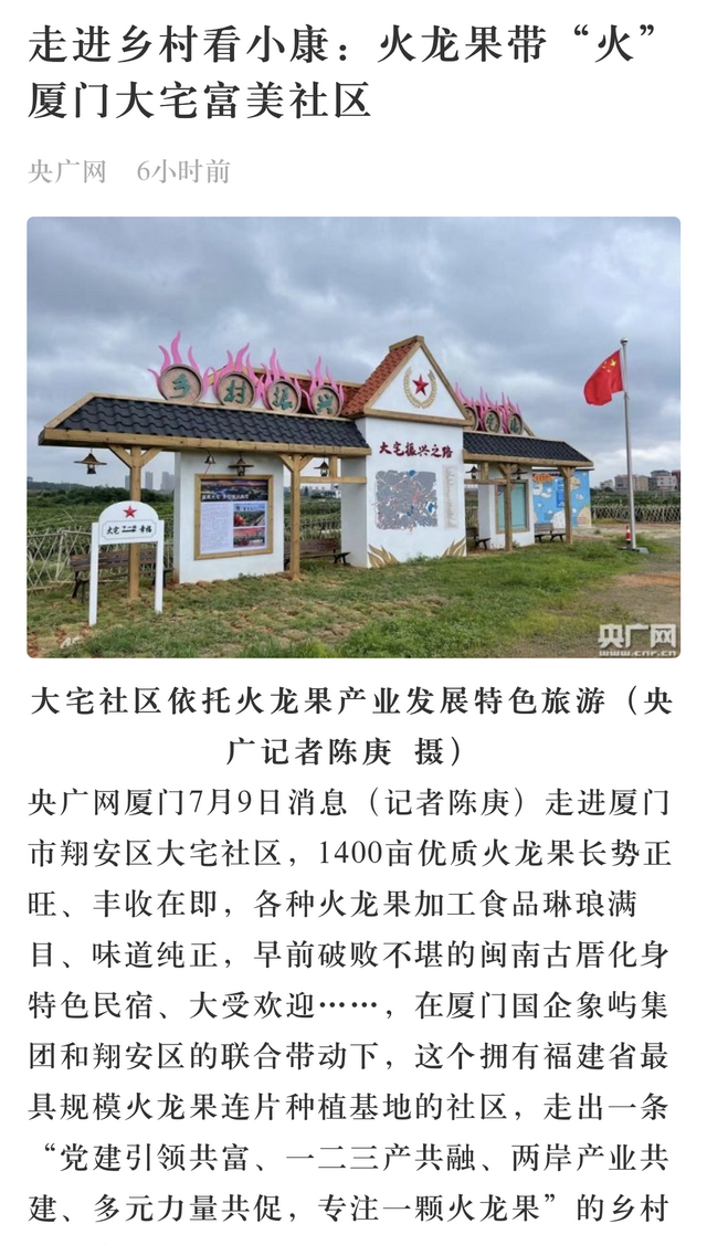 翔安大宅社區(qū)坐落于香山西麓,火龍果種植面積達1400畝,先后被評為全國“一村一品”示范村、福建省黨建富民強村示范基地、廈門市級鄉(xiāng)村振興示范村等。不過,種植火龍果的基地不少,為什么就“火”了翔安大宅?