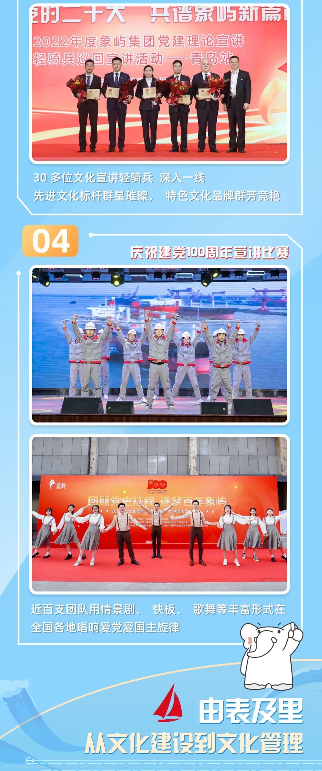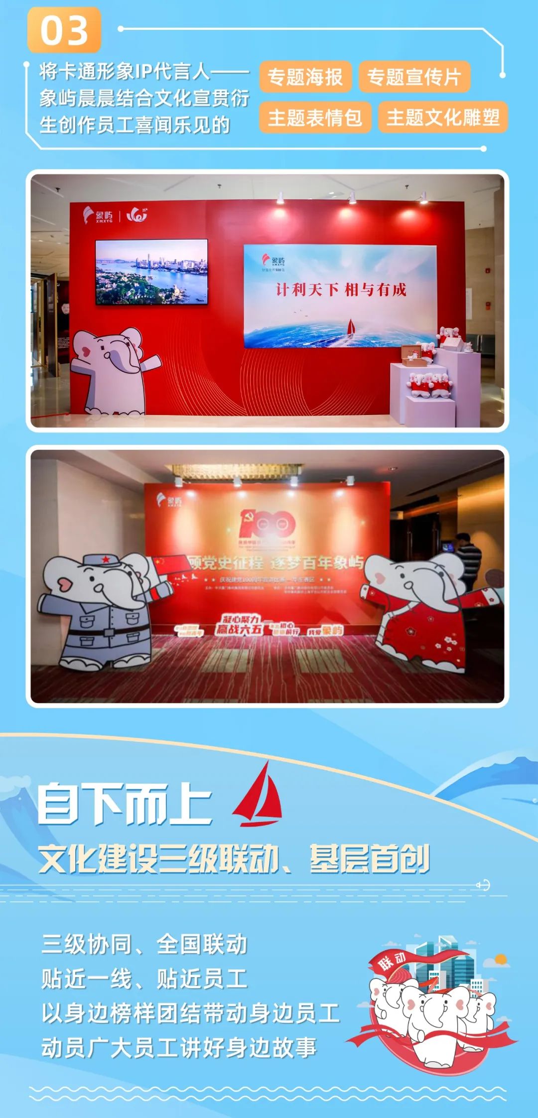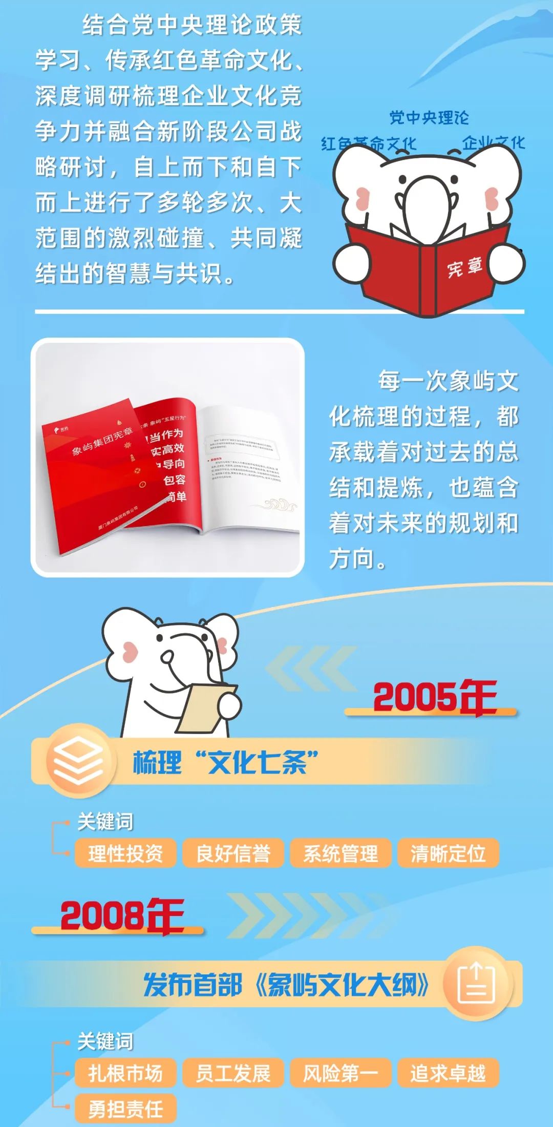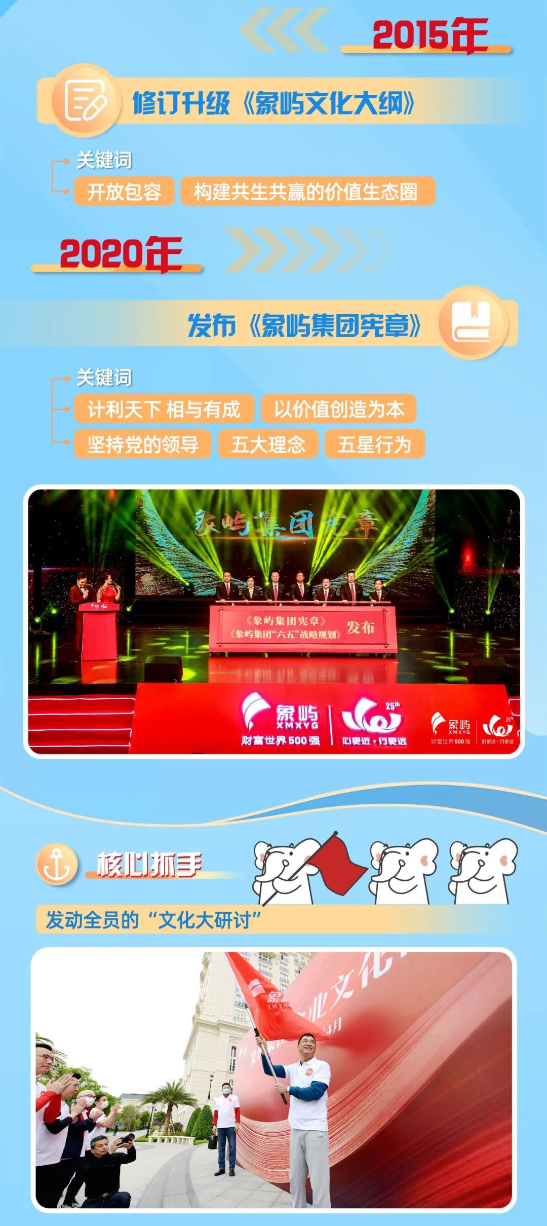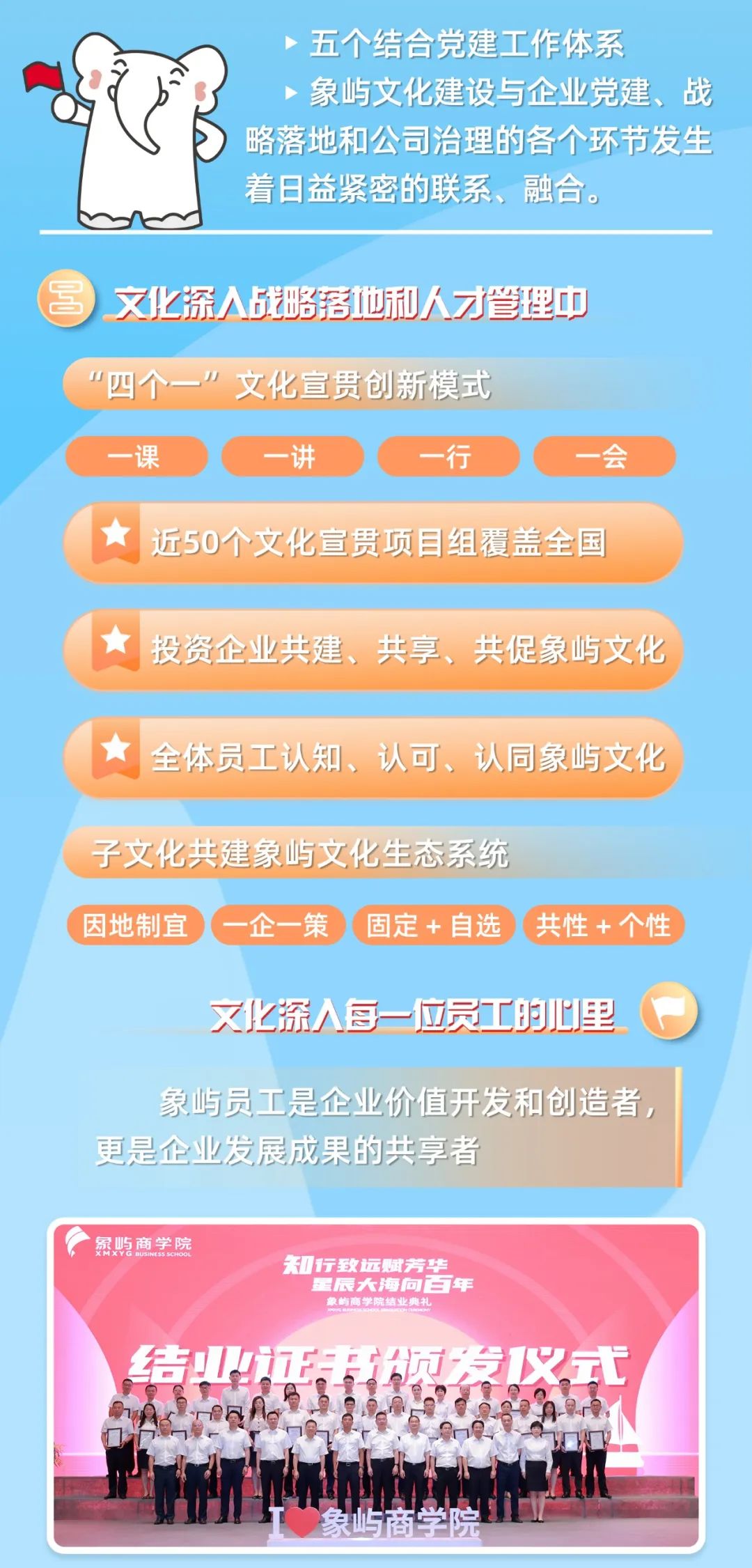 習近平總書記指出:“我們要堅持道路自信、理論自信、制度自信,最根本的還有一個文化自信”“文化自信,是更基礎(chǔ)、更廣泛、更深厚的自信”。27年來,象嶼集團始終堅持黨的領(lǐng)導(dǎo),以創(chuàng)新開拓的特區(qū)精神投身于改革開放和市場經(jīng)濟的發(fā)展浪潮中,歷練出以堅持市場化道路、堅持風險第一等為核心的、蘊含海洋基因的特色企業(yè)文化,為企業(yè)高質(zhì)量發(fā)展筑牢根基,提供強有力的精神動能。